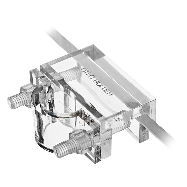 AQUARIO Neo Holder is a transparent acrylic bracket for Filter in- or outflow sets. With this mount, inflow and outflows with a diameter of 13 mm (12/16 mm) up to 17 mm (16/22 mm) can be fixated at aquarium glass up to 12 mm thickness. The supplied bolts and nuts enable much variation for the installation of various aquarium and in-/outflow sizes.