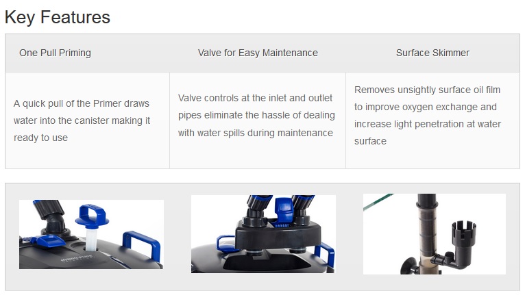 | A quick pull of the Primer draws water into the canister making it ready to use | Valve controls at the inlet and outlet pipes eliminate the hassle of dealing with water spills during maintenance | Removes unsightly surface oil film to improve oxygen exchange and increase light penetration at water surface |