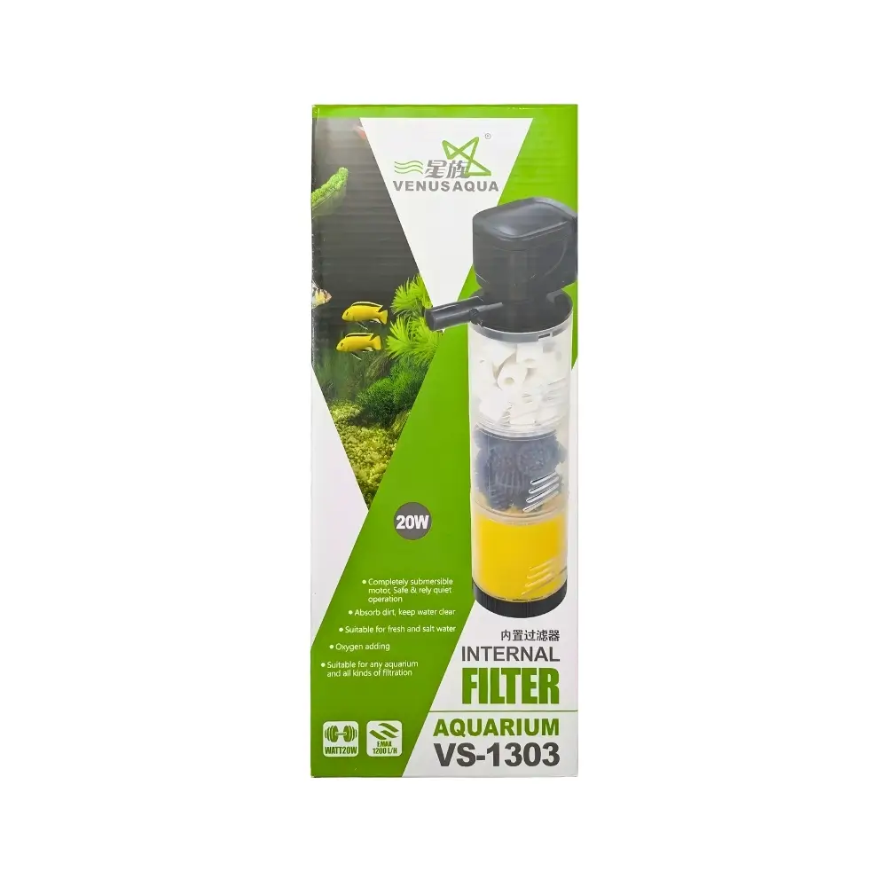 Achieve unmatched water purity with the VENUS AQUA Internal Filter VS-1303 Multi-Stage Internal Filter. This powerful 20 W unit delivers a robust 1200 L/H Aquarium Filter flow rate, ensuring rapid water movement and thorough purification in medium to large tanks. It features three dedicated filter chambers pre-loaded with high-efficiency media, including sponge, bio-balls, and Ceramic Media Filter rings. Buy the VS-1303 today for complete, ready-to-use biological and mechanical filtration.