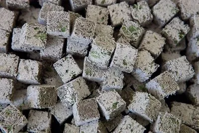 Small pieces of spinach have been added to Black Worms prior to freeze drying.