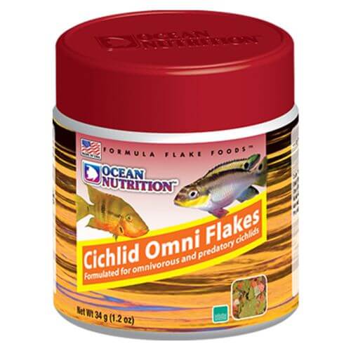 OCEAN NUTRITION Cichlid Omni Flake is scientifically formulated to fulfill the needs of omnivorous and predatory cichlids. From Kribs to Angelfish, these sometimes messy feeders will find everything they require in this staple diet. Key ingredients include salmon fillets, plankton, squid, krill, clams, kelp, herring and brine shrimp. Feed as much as you fish will eat in 2-3 minutes. Distribution 3-4 times per day. This carnivore cichlid food is a delicious staple food specially formulated to stimulate coloration, health and growth of the “King” of the aquarium. The high level of protein and vitamins in this flake will stimulate balanced growth and breeding.