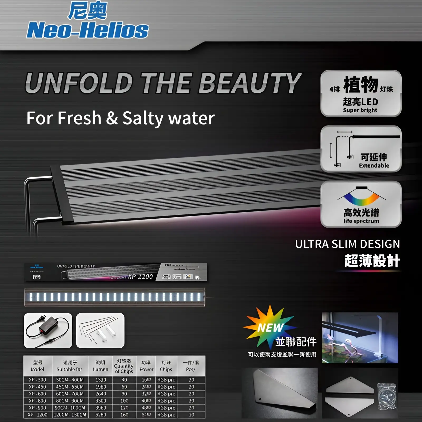NEO HELIOS XP SERIES is a professional range represents with Full Spectrum LED technology for aquascapers, offering a high-PAR WRGB Plant LED solution for every tank size from nano cubes to large 5-foot displays.